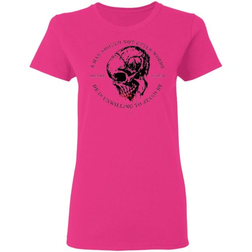 In essence, the “A Man Should Not Utter Words He Is Unwilling To Stand By Dicere Verum” T-shirt promotes the values of honesty, integrity, and accountability in communication. It urges individuals to speak truthfully and authentically, emphasizing the importance of sincerity and thoughtfulness in words and actions.