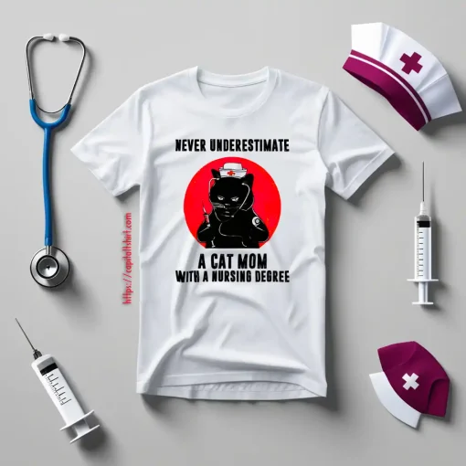 Black Cat Never Underestimate A Cat Mom With A Nursing Degree Shirt