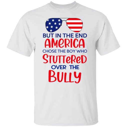This T-shirt bears a powerful message encapsulated in its poignant phrase, “But In The End America Chose The Boy Who Stuttered Over The Bully.” It represents a triumph of courage and resilience over adversity, serving as a reminder of the strength of character and the power of perseverance.