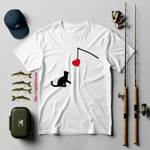 Cat Silhouette Shirt, Cat Looking At Fishing Rod With Heart for Cat Lovers Shirt