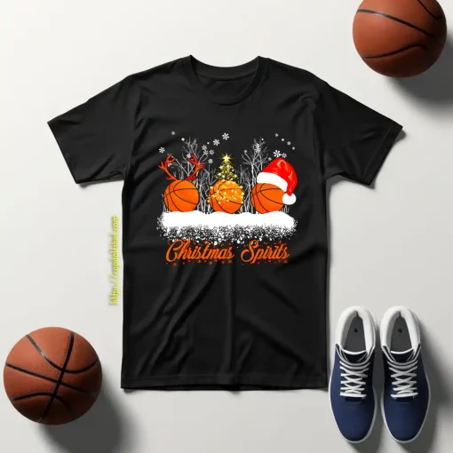 Christmas Spirits Three Basketballs With Reindeer Horns Fairy Lights And Christmas Hat Shirt