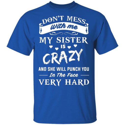 The t-shirt “Don’t Mess With Me My Sister Is Crazy She Will Punch You In The Face Very Hard” is more than just a piece of clothing; it’s a humorous warning to potential troublemakers. This bold statement reflects the protective instincts of siblings and serves as a lighthearted reminder of the fierce loyalty and bond between siblings.