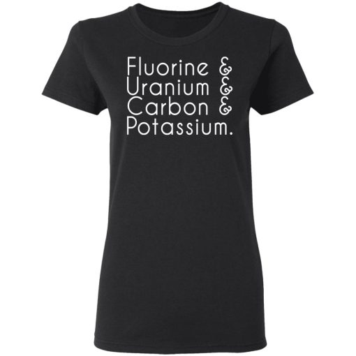 Furthermore, the “Fluorine & Uranium & Carbon & Potassium” T-shirt embodies the concept of “geek chic,” celebrating intelligence and scientific knowledge in a fashionable way. It allows wearers to showcase their affinity for chemistry while making a bold fashion statement.