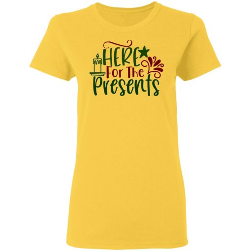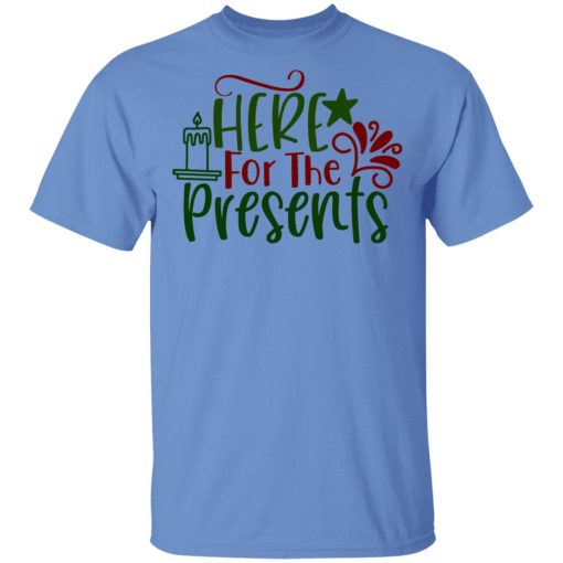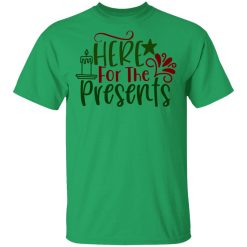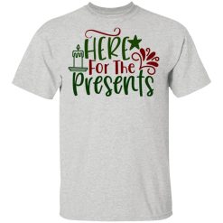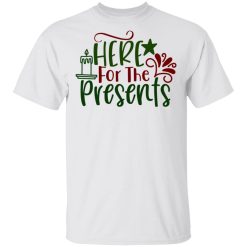 The “Here For The Presents” T-shirt embodies the playful anticipation and excitement surrounding gift-giving during the holiday season. It reflects the joy of receiving presents and the festive spirit of sharing and generosity.