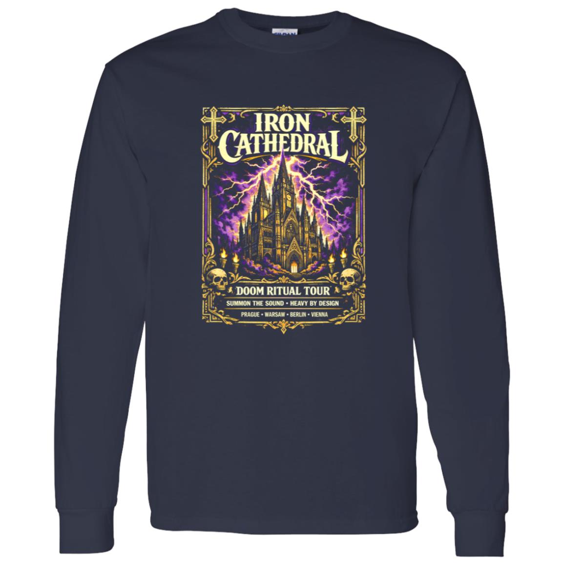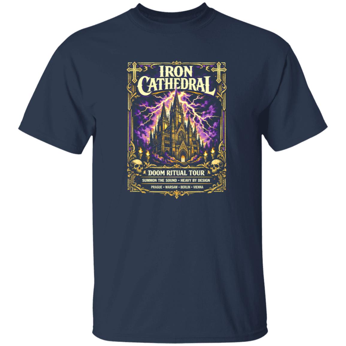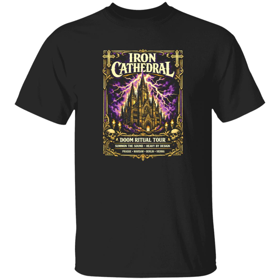 Doom metal artwork has always leaned toward dramatic visual storytelling, and the Iron Cathedral Doom Ritual Tour Shirt follows that tradition closely. The central graphic carries the weight of classic tour poster design—bold imagery framed by strong lettering that feels carved rather than printed.
