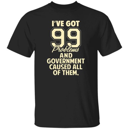The phrase on the T-shirt, “I’ve Got 99 Problems And Government Caused All Of Them,” is a humorous yet pointed way to express frustration with governmental issues. It suggests that many of life’s challenges and problems can be attributed to government policies, regulations, or inefficiencies.