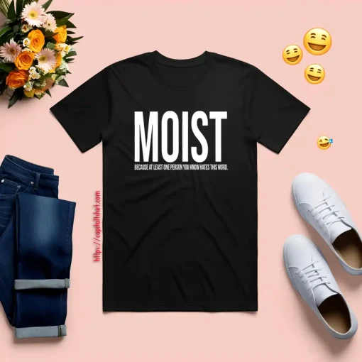 Cultural Impact: Over time, “MOIST” has gained cultural significance, permeating popular culture and sparking debates on its perceived discomfort or allure. Its presence on a T-shirt serves as a reflection of societal attitudes towards language and linguistic taboo.