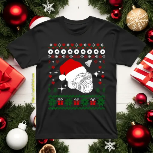 Photography Camera With Santa Hat Ugly Christmas Shirt