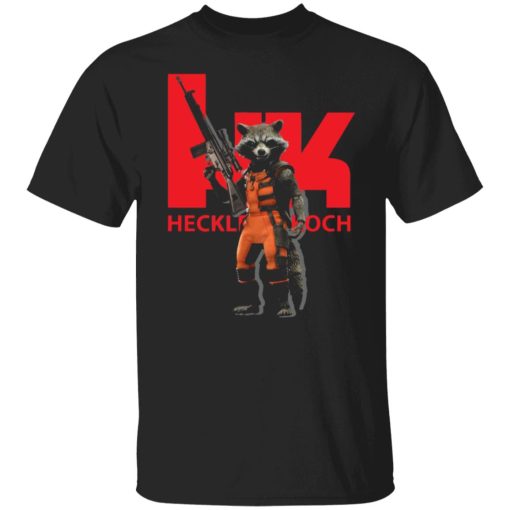 Pop culture apparel works best when the design communicates something instantly. The Rocket Raccoon HK Heckler and Koch shirt does exactly that by combining a recognizable character with a bold visual twist.