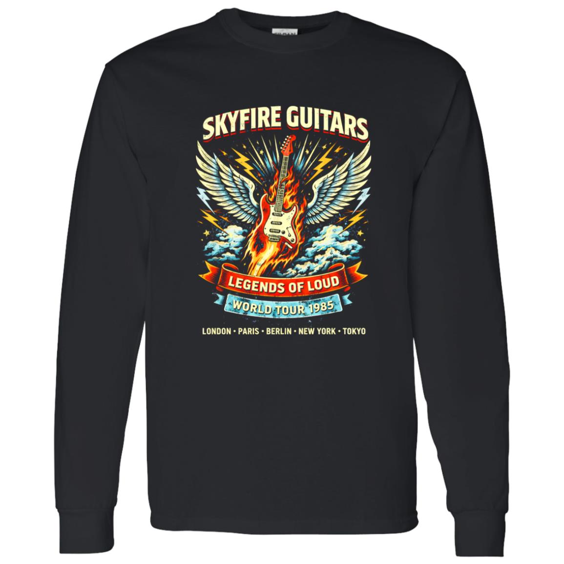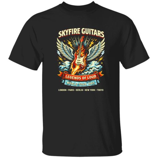 There’s a certain kind of electricity that only exists in the visual language of rock tour culture—something built from stage lights, guitar distortion, and the myth-making energy of live performance. The Skyfire Guitar Legends Tour Shirt doesn’t just echo that atmosphere—it captures it in a form you can wear. Within the broader world of rock band clothing, this piece leans heavily into the visual storytelling that defined legendary tours and the iconography of guitar-driven eras.