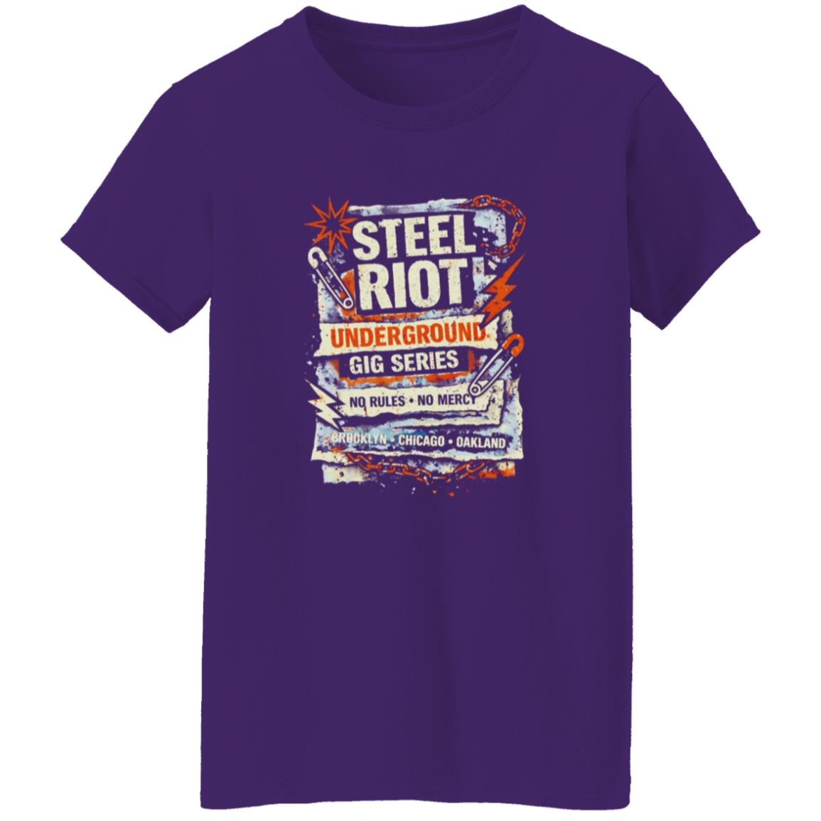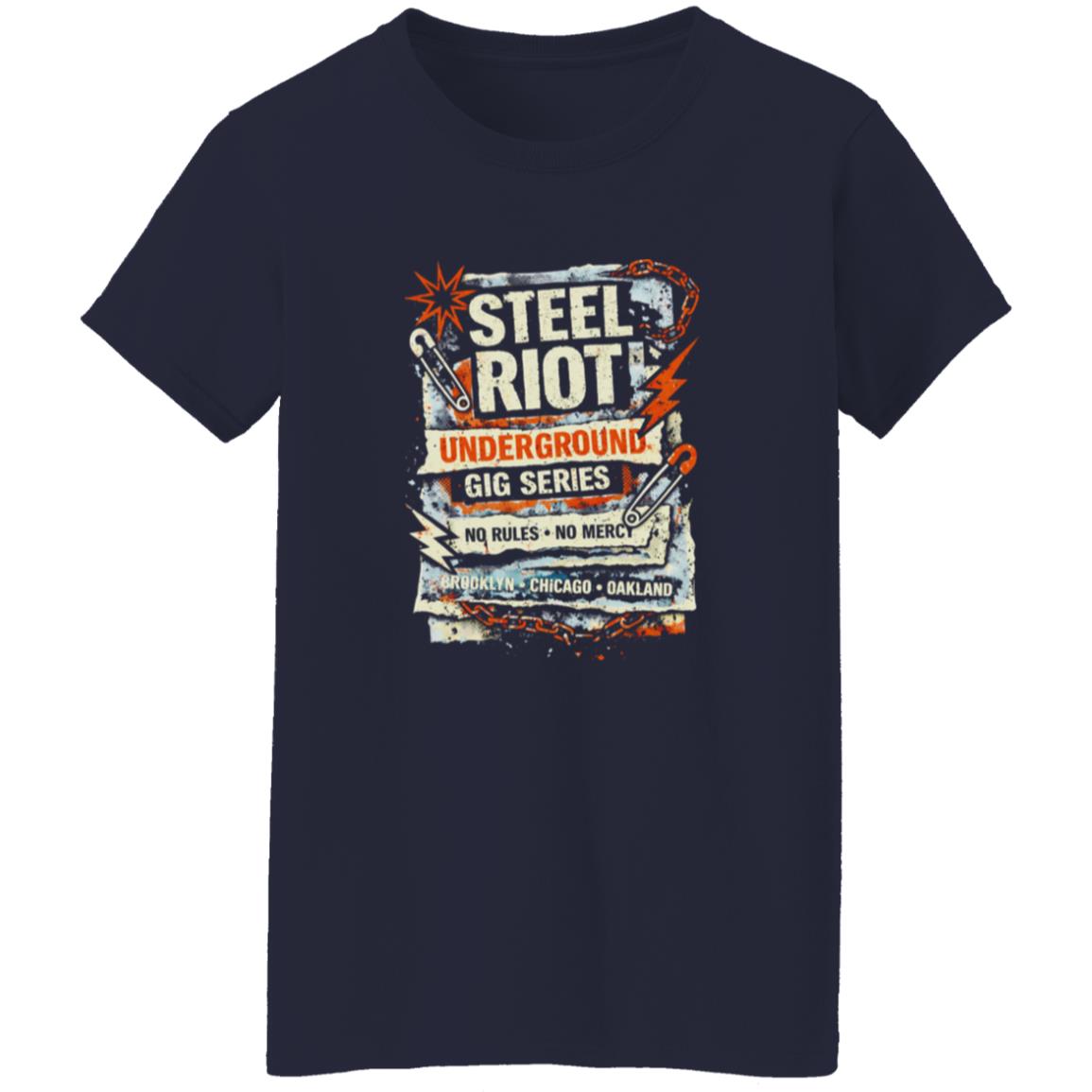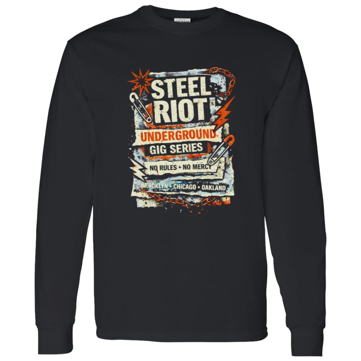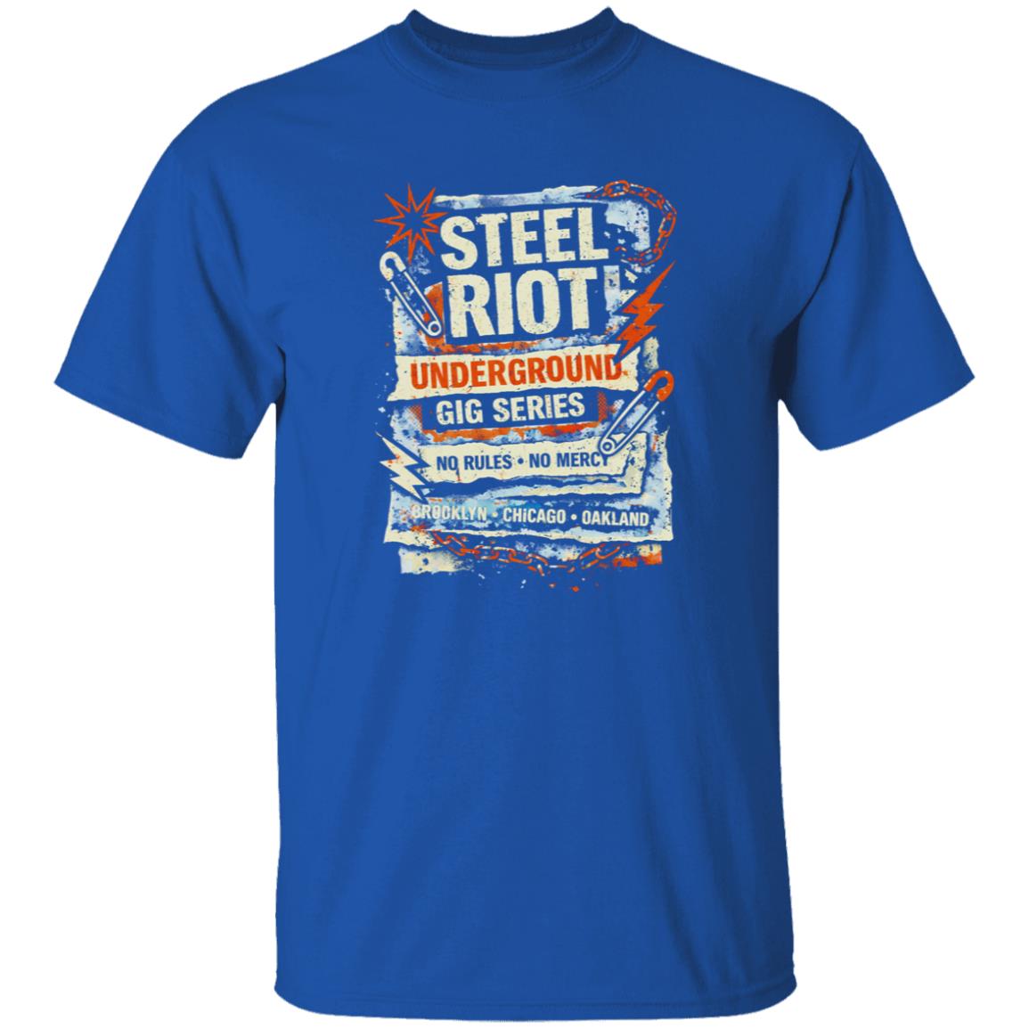 Underground punk visuals were never about precision—they were about immediacy. Flyers printed hours before a show. Hand-drawn logos. Collaged imagery pulled from whatever was available. The Steel Riot Underground Punk Gig Shirt leans into that same visual unpredictability.