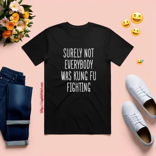 In conclusion, the “Surely Not Everybody Was Kung Fu Fighting” T-shirt combines humor, nostalgia, and cultural reference to create a garment that resonates with many. Its witty phrase and playful irony make it a popular choice for those who appreciate cleverness and lightheartedness in their attire.